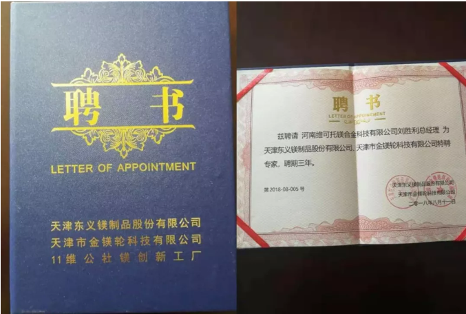 河南鎂合金科技公司劉勝利劉總聘請天津東義鎂制品股份有限公司,天津金鎂輪科技有限公司專家
